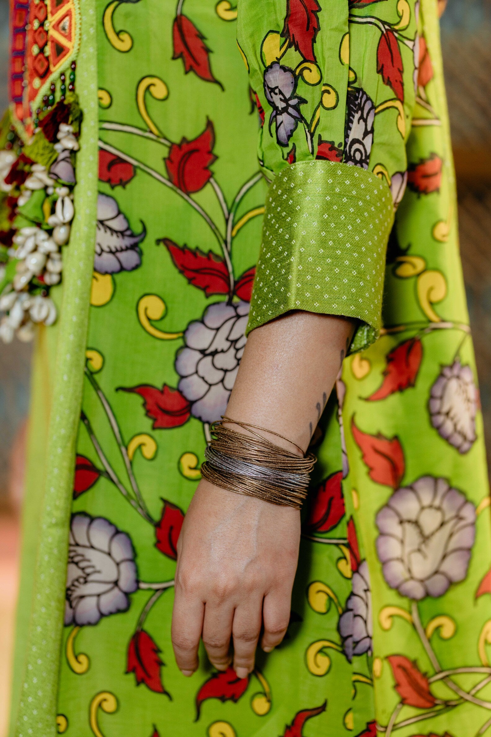 Parrot green kodi tassels with kalamkari fabric, mirror front neck